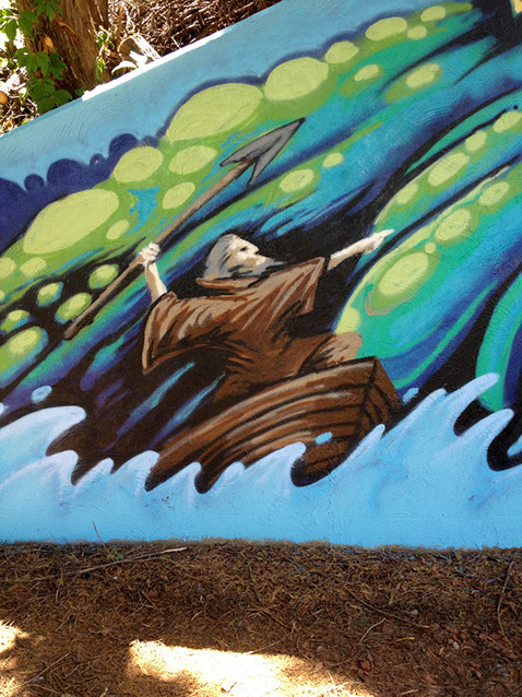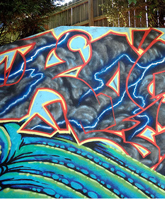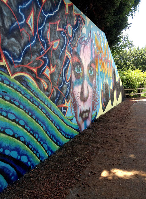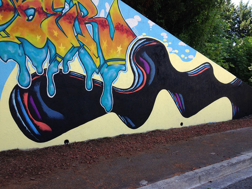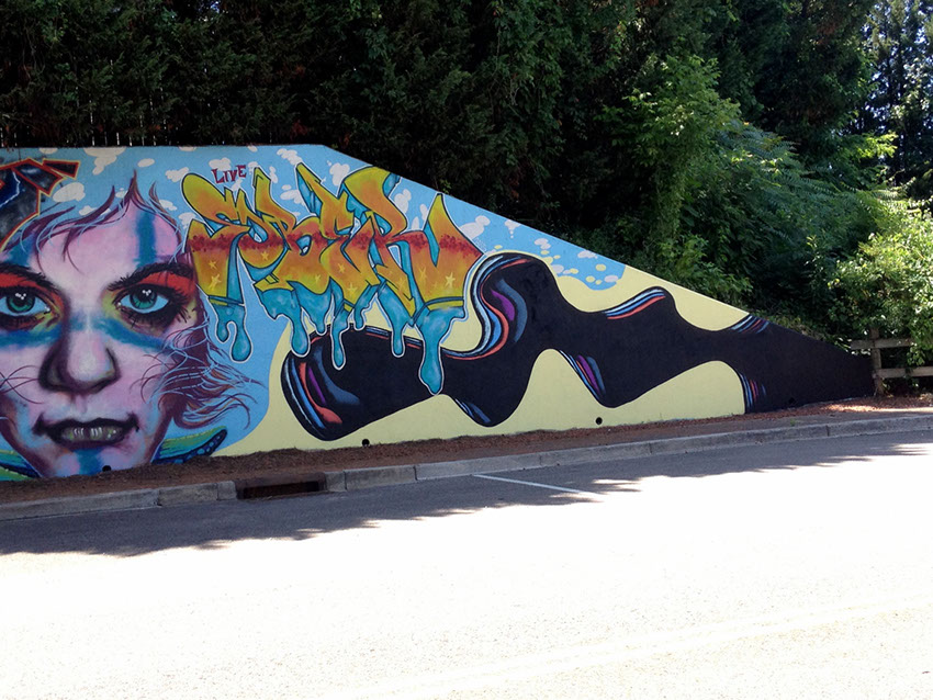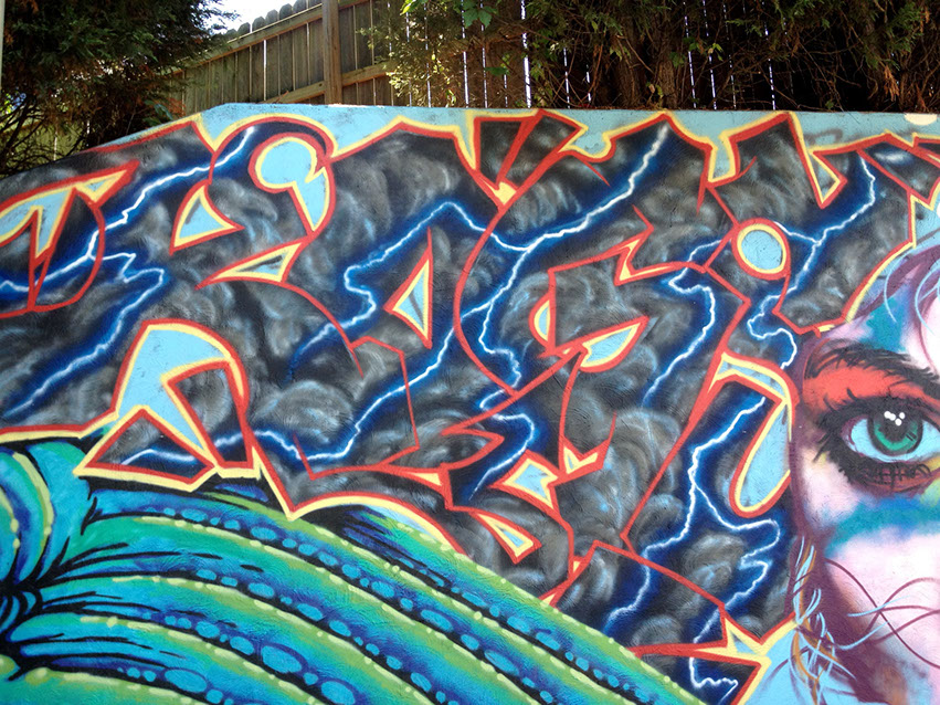 Our process began on Friday June 26th with trimming back some of the over hanging foliage then preparing and priming the face of the wall. After that each artist began work in the medium of their choice be it spray cans or traditional paint. Working side by side allowed us to discuss how each piece could interact with each others to make a more unified composition.