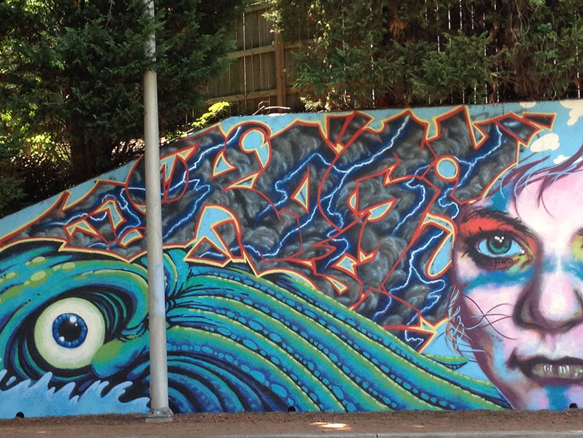 The support wall along Church Street is located along a portion of the Maryville Greenbelt but honestly goes unnoticed to those who travel past it. When the City of Maryville decided that this would be the ideal spot for our first mural project, we were definitely excited to take on a canvas with this kind of exposure. Our initial location proposal, the wall along Cusick St, was long and narrow which made it so each artist's piece would follow a linear layout. Having a larger surface allowed us to build a composition that was more interwoven and worked together in unison with only a few alterations to the original sketches.