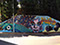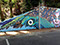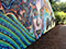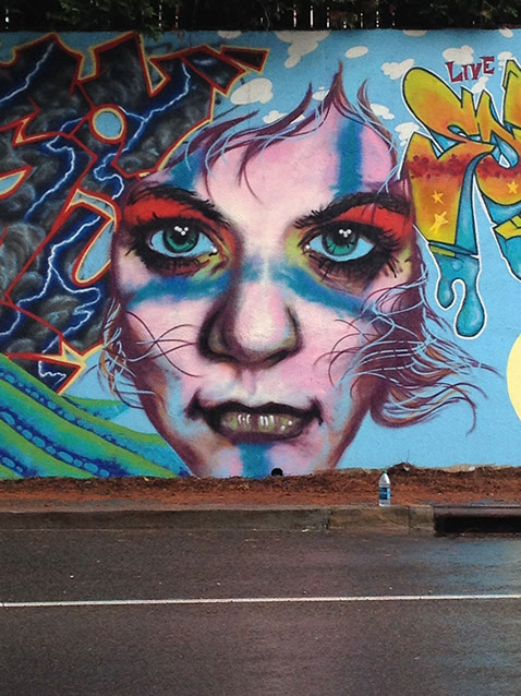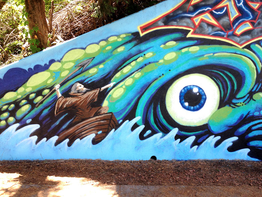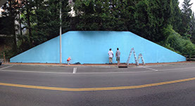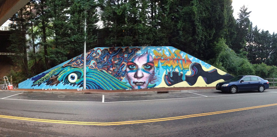 Our process began on Friday June 26th with trimming back some of the over hanging foliage then preparing and priming the face of the wall. After that each artist began work in the medium of their choice be it spray cans or traditional paint. Working side by side allowed us to discuss how each piece could interact with each others to make a more unified composition.